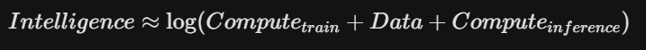 奥特曼指出,AI模型的智能程度与其投入的资源(训练算力、数据、推理算力)的对数成正比 。其数学表达为: