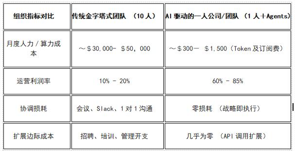 组织演变:10,000人等效公司的终极形态萨姆·奥特曼曾预言,未来将出现价值10亿美元的“一人公司”。到2025年,他进一步细化这一观点:我们将看到由一人掌控、产出等效于1万名员工的公司。这种“等效能力”源于AI Agent对知识工作的全面替代。在2026年的市场中,AI Agents已能处理80%—85%的执行工作,而成本仅为传统团队的2%—5% 。